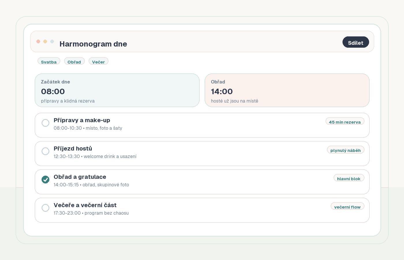 Pokud používáte svatební web nebo online plánování, propojte harmonogram s úkoly, seznamem hostů a dalšími praktickými informacemi. Hosté nemusí dostat složitý dokument, ale měli by snadno vědět, kdy a kde se co děje.