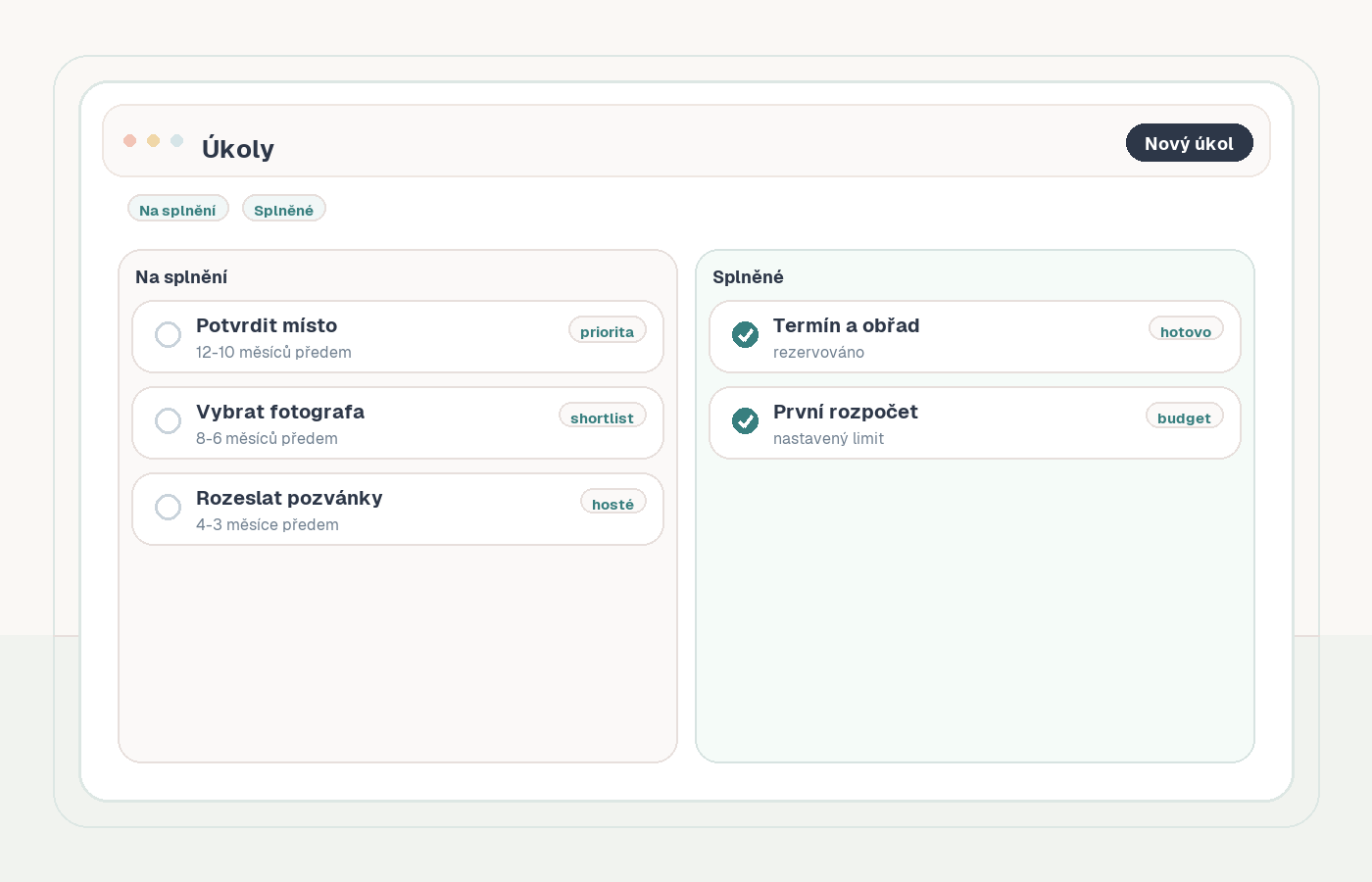 Tento checklist je napsaný pro běžnou českou svatbu s obřadem, hostinou, večerní zábavou a 40-100 hosty.