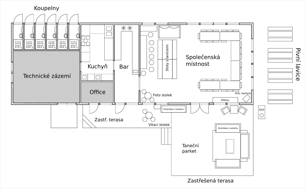 K dispozici je široká škála míst pro obřad, například pod starým dubem, u bazénu nebo na louce, s variantami i pro deštivé počasí. Hlavní společenská chata hostí hostiny a večerní taneční zábavu s kvalitním ozvučením. Pro ubytování až 82 hostů slouží 21 stylových chatek s vlastním grilem a minikuchyňkou. Areál o rozloze 25 000 m² zahrnuje bazén, les, louku a nabízí aktivity jako badminton či paddleboard. Catering a bar lze zajistit, nebo si je můžete přivézt vlastní bez dalších poplatků.
