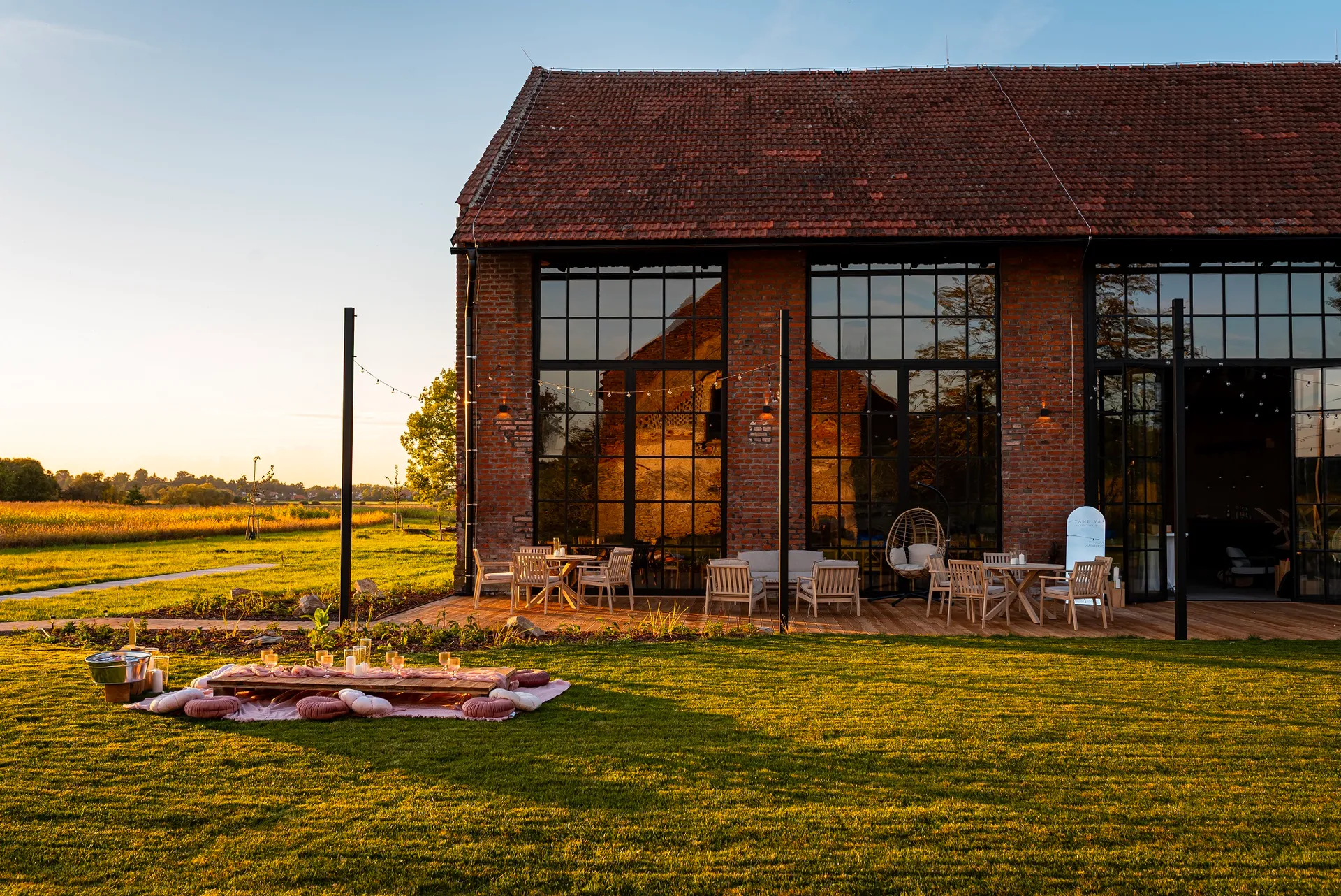 Uvnitř stodoly je k dispozici prostorný sál pro slavnostní tabuli, tanec a zábavu, impozantní bar a komfortní zázemí s plně vybavenou kuchyní, toaletami a sprchami. Pohodlně usadí až 120 hostů, s možností navýšení kapacity po dohodě, a venku je posezení pro dalších 30 osob. Pro ubytování je připraveno šest glampingových stanů pro až 30 osob. Od sezóny 2026 bude navíc k dispozici ubytování přímo ve stodole, včetně novomanželského apartmá, s kapacitou až 12 osob.